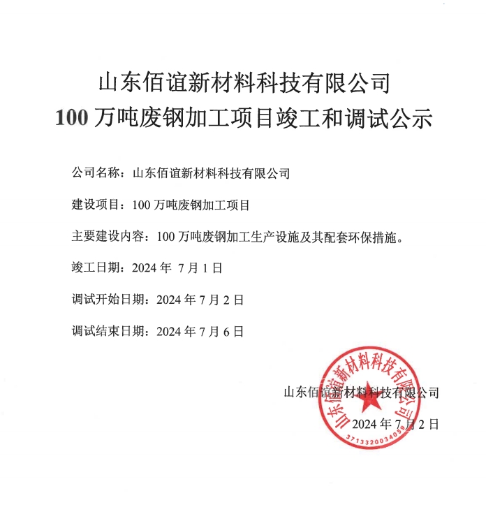 上一篇:山東佰誼新材料科技有限公司150萬噸廢鋼加工項目(一期)環(huán)保設施竣工、調試公示