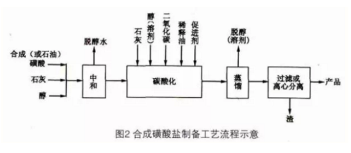 按合成途徑分,以潤滑油餾分作為原料生產(chǎn)的磺酸鹽為石油磺酸鹽;而以各種合成烷基苯為原料生產(chǎn)的磺酸鹽為合成磺酸鹽。石油磺酸鹽是以相對分子質(zhì)量為380的潤滑油餾分為原料。合成磺酸鹽的制備(以鈣鹽為例)是以生產(chǎn)12-烷基苯的副產(chǎn)物重烷基苯或烯經(jīng)與苯烷基化制得的合成烷基苯為原料,然后用發(fā)煙硫酸或So3進(jìn)行磺化,得到石油磺酸或合成磺酸;再用石灰與磺酸反應(yīng)(金屬化)生成中性磺酸鈣鹽;最后碳酸化,在醇類促進(jìn)劑存在條件下,加入石灰并通入二氧化碳,得到中堿值或高堿值磺酸鈣鹽。合成磺酸鹽的制備工藝流程見圖2。