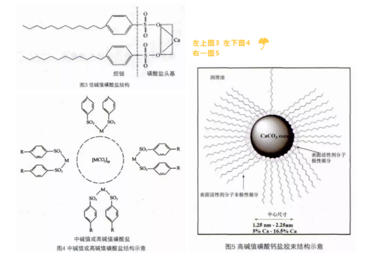低堿值磺酸鹽中的油溶性烷基為C18~C20或以上,對油有充分溶解性的磺酸分子量在450以上。高堿值磺酸鈣鹽是通過將過剩的堿以碳酸鈣的形式分散在膠束中,形成高堿性磺酸鹽。以碳酸鈣的形式分散的鈣鹽與磺酸鹽的鈣鹽之比超過30:1。